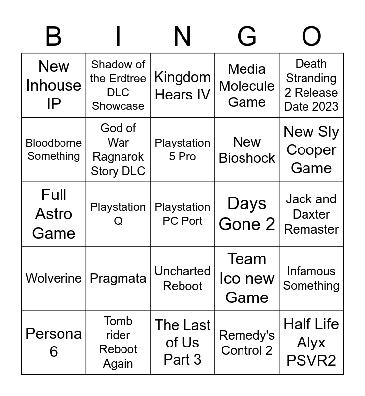This bingo card has a free space and 24 words: Pragmata, Tomb rider Reboot Again, Playstation 5 Pro, Persona 6, Death Stranding 2 Release Date 2023, New Inhouse IP, Bloodborne Something, Shadow of the Erdtree DLC Showcase, Days Gone 2, Uncharted Reboot, New Bioshock, Full Astro Game, Team Ico new Game, Infamous Something, God of War Ragnarok Story DLC, Remedy's Control 2, Jack and Daxter Remaster, Kingdom Hears IV, New Sly Cooper Game, Playstation Q, Half Life Alyx PSVR2, Wolverine, Media Molecule Game and The Last of Us Part 3.
