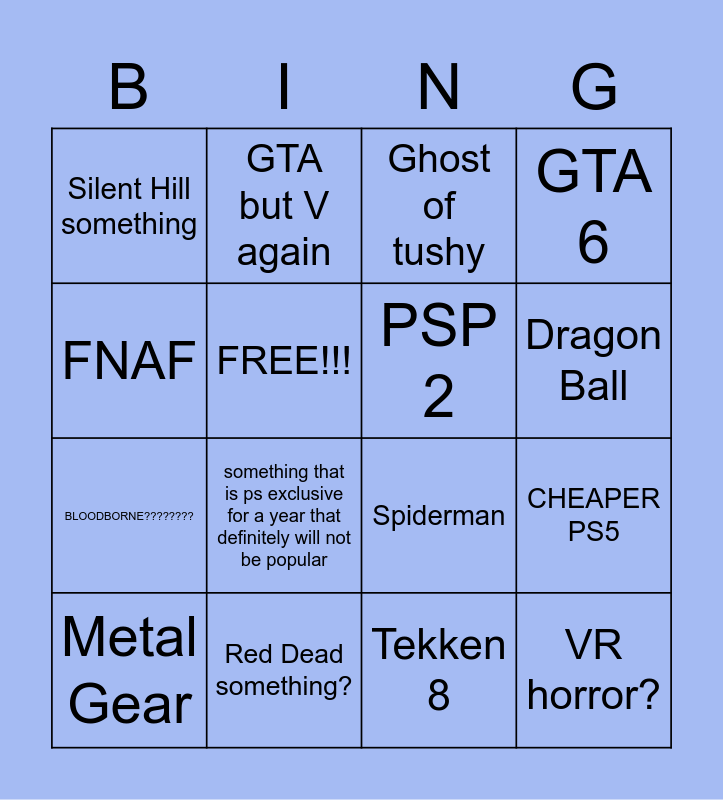This bingo card has 16 words: Red Dead something?, CHEAPER PS5, Ghost of tushy, Silent Hill something, BLOODBORNE????????, GTA but V again, Spiderman, Tekken 8, FNAF, FREE!!!, Metal Gear, GTA 6, something that is ps exclusive for a year that definitely will not be popular, Dragon Ball, PSP 2 and VR horror?.