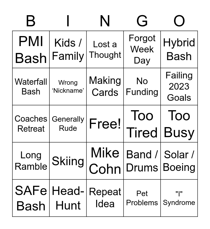 This bingo card has a free space and 24 words: Skiing, Head-Hunt, Making Cards, SAFe Bash, Hybrid Bash, PMI Bash, Waterfall Bash, Kids / Family, Too Tired, Mike Cohn, No Funding, Coaches Retreat, Band / Drums, Solar / Boeing, Wrong ‘Nickname’, Pet Problems, Too Busy, Lost a Thought, Failing 2023 Goals, Generally Rude, "I" Syndrome, Long Ramble, Forgot Week Day and Repeat Idea.