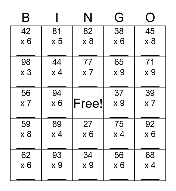 This bingo card has a free space and 24 words: 89 x 4 ____, 93 x 9 ____, 77 x 7 ____, 62 x 6 ____, 45 x 8 ____, 42 x 6 ____, 98 x 3 ____, 81 x 5 ____, 37 x 9 ____, 27 x 6 ____, 65 x 9 ____, 56 x 7 ____, 75 x 4 ____, 92 x 6 ____, 44 x 4 ____, 56 x 6 ____, 39 x 7 ____, 82 x 8 ____, 71 x 9 ____, 94 x 6 ____, 68 x 4 ____, 59 x 8 ____, 38 x 6 ____ and 34 x 9 ____.