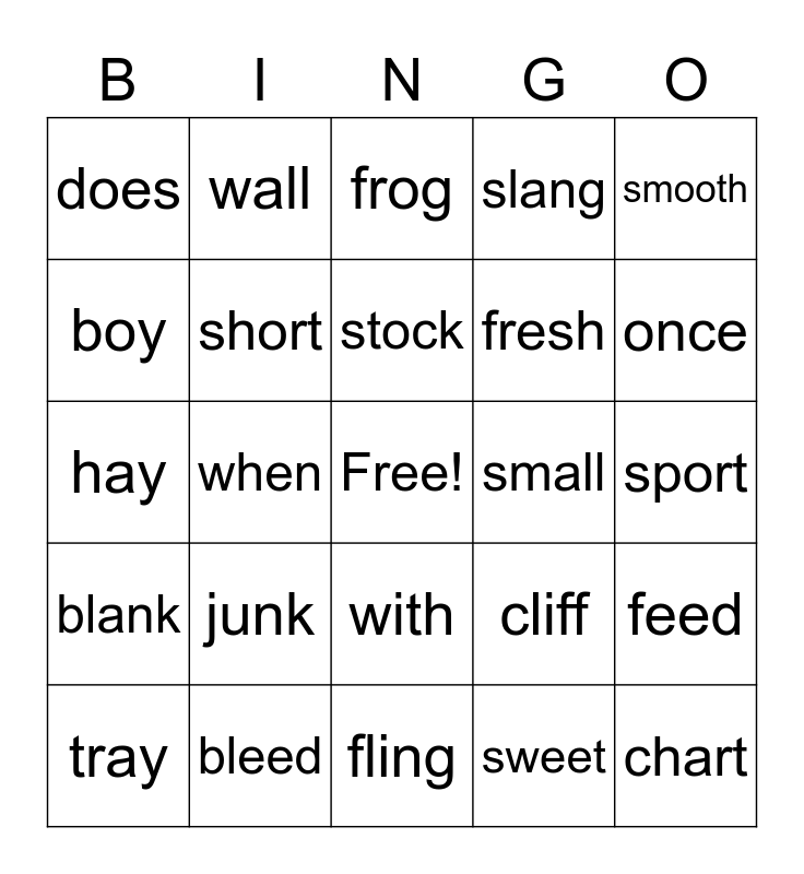 This bingo card has a free space and 39 words: thing, droop, check, short, tray, with, stock, starch, smooth, blank, when, slang, chart, sport, small, junk, toy, does, creep, cliff, boy, fling, fresh, once, slot, bring, chess, what, fly, wall, horn, drip, frog, bleed, sweet, quick, feed, hay and speech.