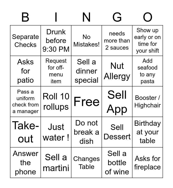 This bingo card has a free space and 34 words: Compliment from a member, Sell a bottle of wine, Pre-bus another table, Run another tables food, Take-out, Request for off-menu item, Show up early or on time for your shift, Answer the phone, Drunk before 9:30 PM, Side of mayo, Sell a dinner special, No Mistakes!, Don't say anything bad about members, Orders a second bread basket, Sell App, Add seafood to any pasta, Sell a martini, Pass a uniform check from a manager, Just water !, Sell Dessert, Do not break a dish, "Ill just go in the lounge", Separate Checks, Booster / Highchair, Changes Table, Asks for fireplace, needs more than 2 sauces, No sides, Nut Allergy, Asks for patio, more children than adults at the table, Roll 10 rollups, Birthday at your table and Extra lemons.