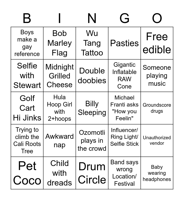 This bingo card has a free space and 24 words: Awkward nap, Child with dreads, Double doobies, Pet Coco, Free edible, Boys make a gay reference, Selfie with Stewart, Bob Marley Flag, Michael Franti asks "How you Feelin", Ozomotli plays in the crowd, Gigantic Inflatable RAW Cone, Golf Cart Hi Jinks, Influencer/ Ring Light/ Selfie Stick, Unauthorized vendor, Midnight Grilled Cheese, Band says wrong Location/ Festival, Groundscore drugs, Wu Tang Tattoo, Someone playing music, Hula Hoop Girl with 2+hoops, Baby wearing headphones, Trying to climb the Cali Roots Tree, Pasties and Drum Circle.