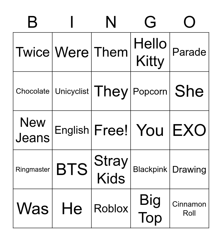 This bingo card has a free space and 34 words: Circus, Big Top, Trapeze Artist, Tightrope Walker, Ringmaster, Unicyclist, Parade, Was, Were, Clown, They, Them, I, We, You, She, He, New Jeans, BTS, Blackpink, Stray Kids, Acrobat, Twice, EXO, Roblox, Cinnamon Roll, Hello Kitty, Demon Slayer, Popcorn, Chocolate, Spy X Family, English, Drawing and Singing.