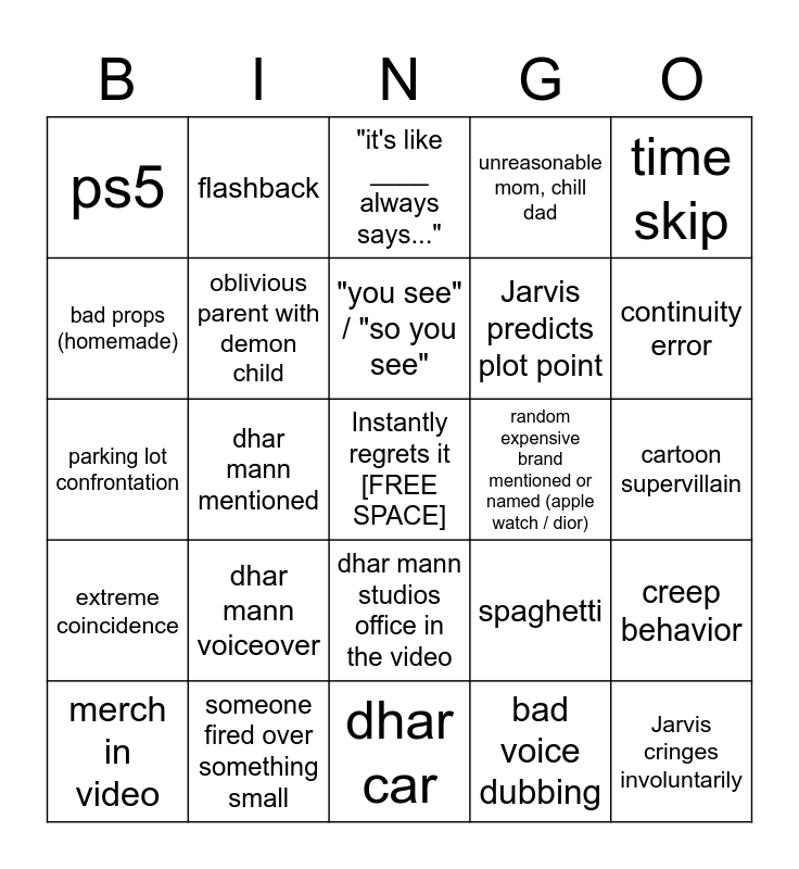 This bingo card has a free space and 25 words: dhar mann voiceover, dhar car, "you see" / "so you see", merch in video, time skip, ps5, bad props (homemade), flashback, random expensive brand mentioned or named (apple watch / dior), dhar mann studios office in the video, Jarvis predicts plot point, parking lot confrontation, spaghetti, creep behavior, oblivious parent with demon child, kids with ipad, cartoon supervillain, "it's like ____ always says...", continuity error, dhar mann mentioned, Jarvis cringes involuntarily, someone fired over something small, extreme coincidence, unreasonable mom, chill dad and bad voice dubbing.