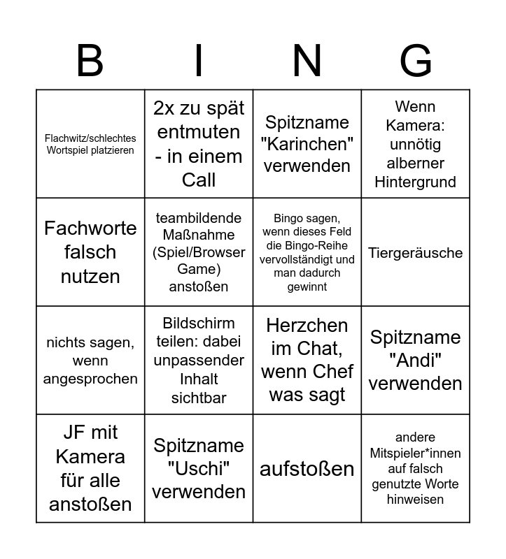 This bingo card has 16 words: Spitzname "Uschi" verwenden, Spitzname "Andi" verwenden, Spitzname "Karinchen" verwenden, Flachwitz/schlechtes Wortspiel platzieren, nichts sagen, wenn angesprochen, 2x zu spät entmuten - in einem Call, Herzchen im Chat, wenn Chef was sagt, aufstoßen, Fachworte falsch nutzen, teambildende Maßnahme (Spiel/Browser Game) anstoßen, JF mit Kamera für alle anstoßen, Wenn Kamera: unnötig alberner Hintergrund, Bildschirm teilen: dabei unpassender Inhalt sichtbar, Tiergeräusche, Bingo sagen, wenn dieses Feld die Bingo-Reihe vervollständigt und man dadurch gewinnt and andere Mitspieler*innen auf falsch genutzte Worte hinweisen.
