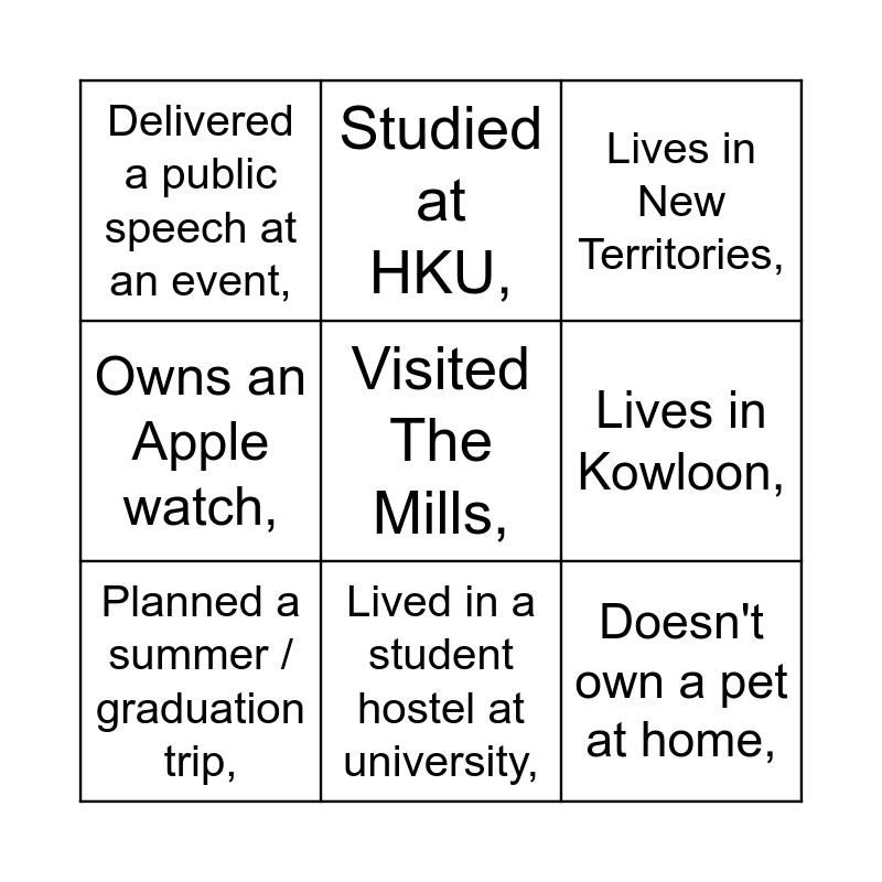 This bingo card has 27 words: Owns a dog at home,, Owns a cat at home,, Doesn't own a pet at home,, Lives in HK Island,, Lives in Kowloon,, Lives in New Territories,, Studied at HKU,, Studied at CUHK,, Studied at PolyU,, iPhone user,, Andriod user,, Owns an Apple watch,, plays piano,, plays soccer,, plays golf,, Exchanged or studied abroad,, Planned a summer / graduation trip,, Lived in a student hostel at university,, Used ChatGPT,, Delivered a public speech at an event,, Participated in community services in the last 12 months,, Had a part-time / summer job in the real estate field,, Has followed Knight Frank Greater China's social media account(s),, Has a friend who works at Knight Frank Hong Kong,, Visited M+ Museum,, Visited The Mills, and Visited Tai Kwun.