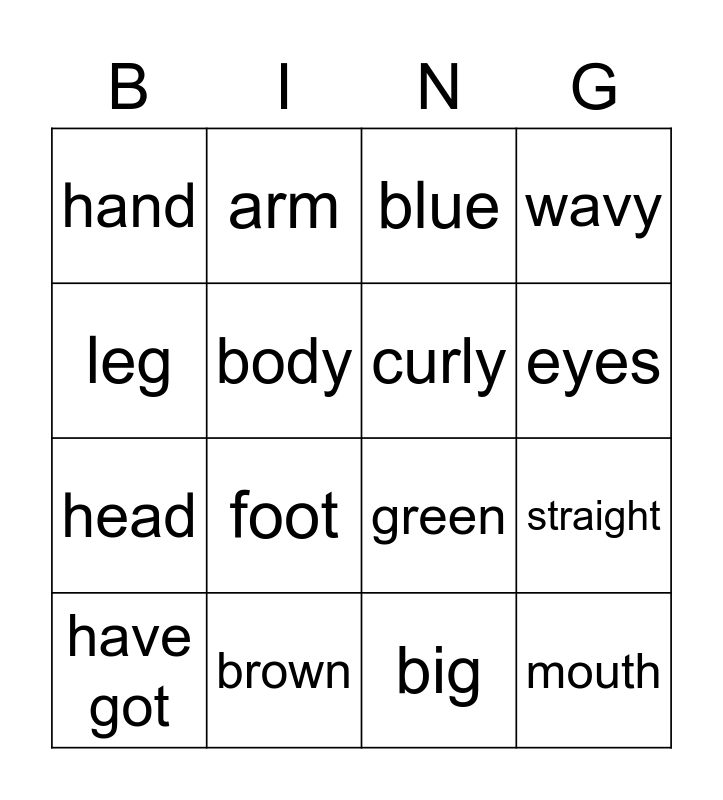 This bingo card has 23 words: mouth, ears, eyes, nose, leg, hand, body, arm, have got, lips, foot, head, hair, blonde, brown, black, blue, green, curly, straight, wavy, big and small.