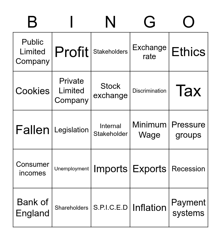 This bingo card has 25 words: Unemployment, S.P.I.C.E.D, Stock exchange, Bank of England, Ethics, Public Limited Company, Cookies, Profit, Minimum Wage, Imports, Discrimination, Fallen, Exports, Recession, Private Limited Company, Payment systems, Pressure groups, Stakeholders, Tax, Legislation, Internal Stakeholder, Shareholders, Consumer incomes, Exchange rate and Inflation.