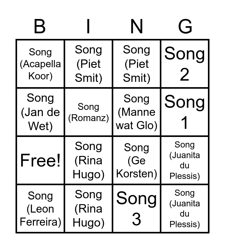 This bingo card has 20 words: Song (Juanita du Plessis), Song (Manne wat Glo), Song (Piet Smit), Song (Willie Joubert), Song (Leon Ferreira), Song (Jan de Wet), Song (Rina Hugo), Song (Acapella Koor), Free!, Song (Piet Smit), Song (Rina Hugo), Song (Ge Korsten), Song (Romanz), Song (Juanita du Plessis), Song (Manne wat Glo), Song (Jan de Wet), Song 1, Song 2, Song 3 and Song 4.