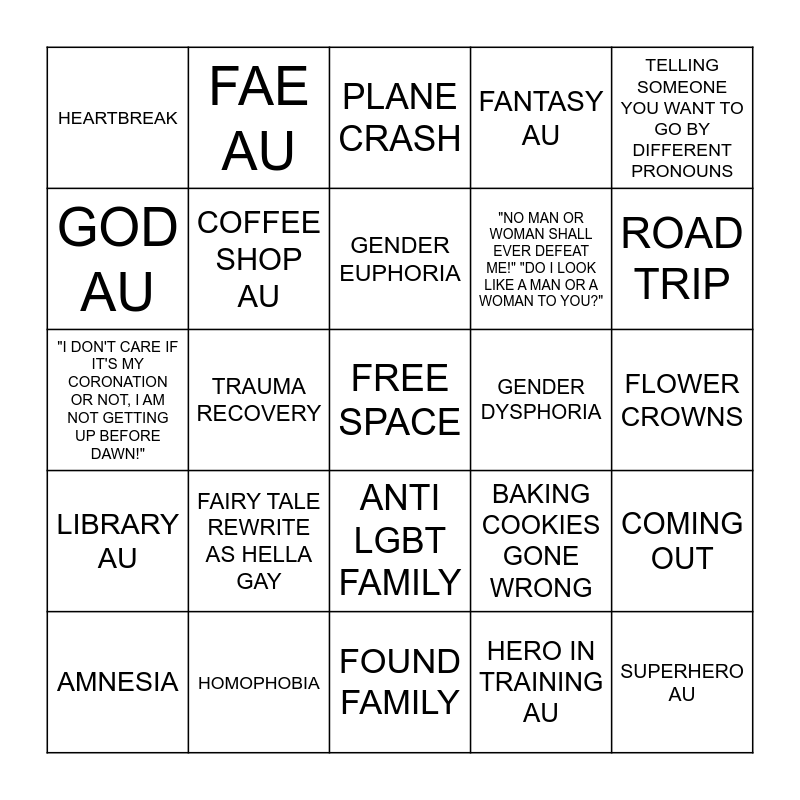 This bingo card has a free space and 24 words: FAIRY TALE REWRITE AS HELLA GAY, HOMOPHOBIA, GENDER EUPHORIA, AMNESIA, TELLING SOMEONE YOU WANT TO GO BY DIFFERENT PRONOUNS, HEARTBREAK, GOD AU, FAE AU, GENDER DYSPHORIA, ANTI LGBT FAMILY, "NO MAN OR WOMAN SHALL EVER DEFEAT ME!" "DO I LOOK LIKE A MAN OR A WOMAN TO YOU?", "I DON'T CARE IF IT'S MY CORONATION OR NOT, I AM NOT GETTING UP BEFORE DAWN!", BAKING COOKIES GONE WRONG, COMING OUT, COFFEE SHOP AU, HERO IN TRAINING AU, FLOWER CROWNS, PLANE CRASH, ROAD TRIP, TRAUMA RECOVERY, SUPERHERO AU, LIBRARY AU, FANTASY AU and FOUND FAMILY.