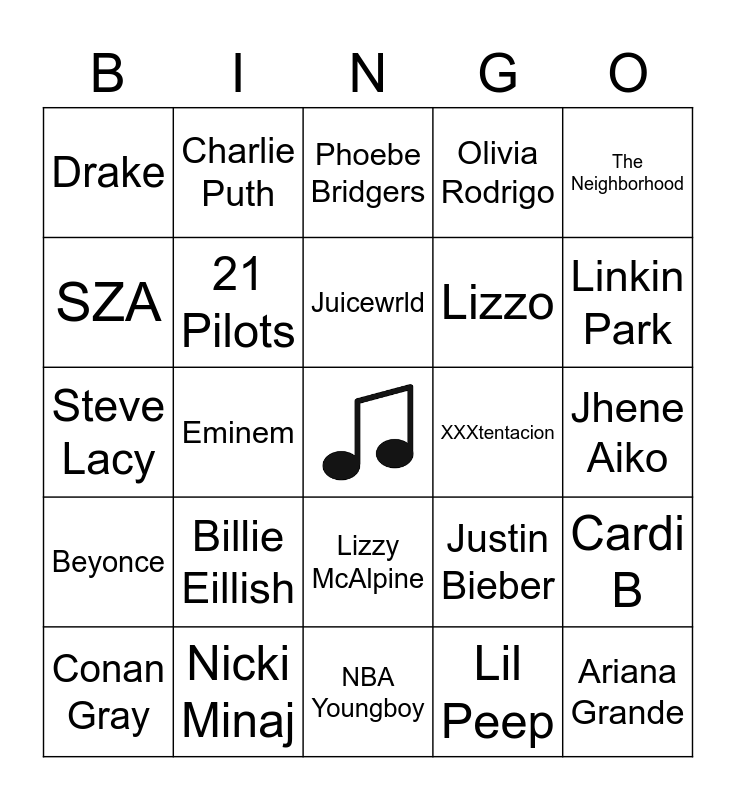 This bingo card has a free space and 49 words: Taylor Swift, Ariana Grande, Rod Wave, NBA Youngboy, Billie Eillish, Bruno Mars, Charlie Puth, Luke Bryan, SZA, Miley Cyrus, 21 Pilots, Olivia Rodrigo, Cardi B, Justin Bieber, The Weeknd, Harry Styles, Juicewrld, XXXtentacion, Post Malone, The Neighborhood, Eminem, Lil Peep, Drake, Lizzo, Glass Animals, Linkin Park, Conan Gray, Joji, Lizzy McAlpine, Beyonce, Summer Walker, Kehlani, Alicia Keys, Brent Faiyaz, Nicki Minaj, H.E.R., Keyshia Cole, Travis Scott, Jhene Aiko, Usher, Jonas Brothers, BTS, My Chemical Romance, BLACKPINK, Steve Lacy, Phoebe Bridgers, Doja Cat, Dua Lipa and Demi Lovato.