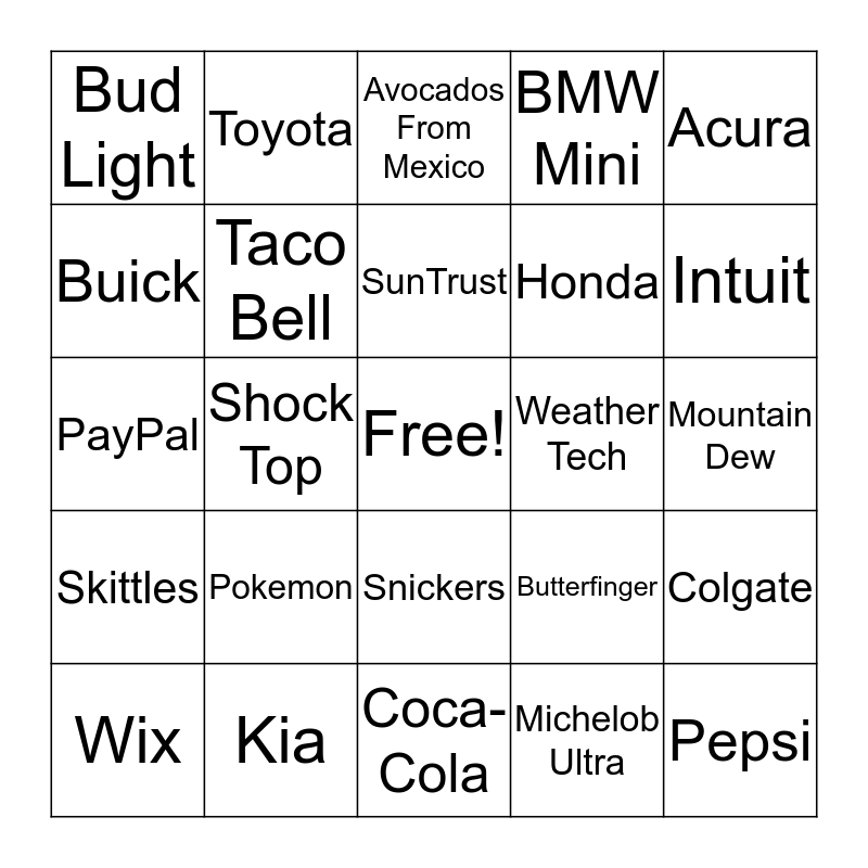 This bingo card has a free space and 29 words: Wix, Doritos, Shock Top, Budweiser, Bud Light, Avocados From Mexico, Taco Bell, Pokemon, Weather Tech, Kia, Mountain Dew, Pepsi, Coca-Cola, Michelob Ultra, Intuit, Hyundai, Snickers, Skittles, Acura, PayPal, Butterfinger, LG, Honda, Buick, BMW Mini, Toyota, Colgate, SunTrust and TurboTax.