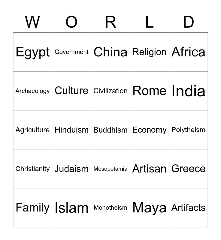 This bingo card has 25 words: Judaism, Monotheism, Civilization, Family, Africa, Egypt, Archaeology, Government, Economy, Mesopotamia, Rome, Agriculture, Artisan, Greece, Culture, Artifacts, Polytheism, China, India, Hinduism, Buddhism, Islam, Christianity, Religion and Maya.