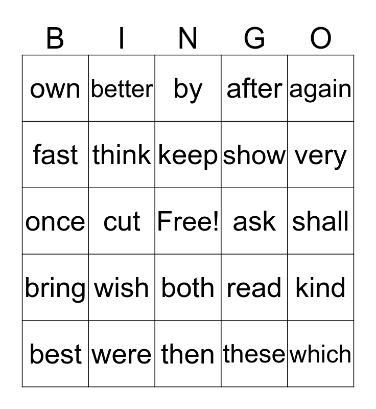 This bingo card has a free space and 24 words: wish, were, keep, best, again, own, fast, better, ask, both, show, once, read, kind, think, these, shall, by, very, cut, which, bring, after and then.