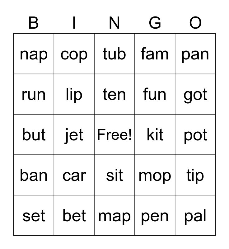 This bingo card has a free space and 24 words: car, bet, ten, set, pan, nap, run, cop, kit, sit, fun, but, mop, tip, lip, pen, pot, tub, got, jet, pal, ban, fam and map.