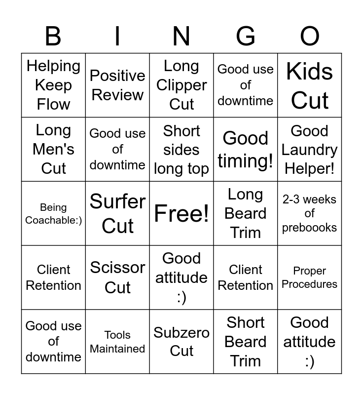 This bingo card has a free space and 24 words: Scissor Cut, Tools Maintained, Short sides long top, Good use of downtime, Kids Cut, Helping Keep Flow, Long Men's Cut, Positive Review, Long Beard Trim, Good attitude :), Good timing!, Being Coachable:), Client Retention, Proper Procedures, Good use of downtime, Short Beard Trim, 2-3 weeks of preboooks, Long Clipper Cut, Good Laundry Helper!, Surfer Cut, Good attitude :), Client Retention, Good use of downtime and Subzero Cut.