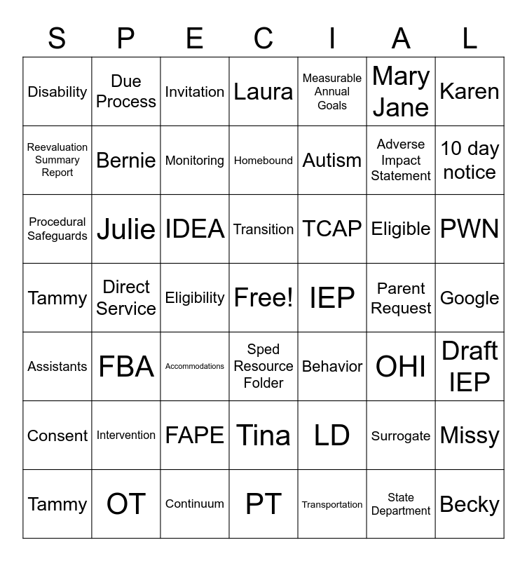 This bingo card has a free space and 62 words: Angela, Tammy, Carole, Julie, Becky, Missy, Karen, Jo, Bernie, Tammy, Laura, Tina, Mary Jane, IEP, Timelines, Disability, Adverse Impact Statement, Measurable Annual Goals, Evaluation, Reevaluation Summary Report, 10 day notice, Invitation, PWN, Eligibility, Manifestation, Behavior, FBA, BIP, Eligible, Draft IEP, Least Restrictive Environment, FAPE, State Department, Federal Law, Procedural Safeguards, Due Process, LD, OHI, Autism, Parent Request, Homebound, Surrogate, IDEA, Related Service, Monitoring, TCAP, Accommodations, OT, PT, Transportation, Transition, Direct Service, Consultation, Intervention, Confidentiality, Google, Sped Resource Folder, Consent, Continuum, ESY, Assistants and Pre-vocational.