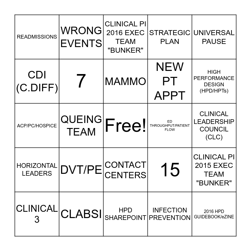 This bingo card has a free space and 24 words: DVT/PE, CLABSI, MAMMO, CLINICAL 3, UNIVERSAL PAUSE, READMISSIONS, CDI (C.DIFF), WRONG EVENTS, ED THROUGHPUT/PATIENT FLOW, CONTACT CENTERS, NEW PT APPT, ACP/PC/HOSPICE, 15, CLINICAL PI 2015 EXEC TEAM "BUNKER", 7, INFECTION PREVENTION, CLINICAL LEADERSHIP COUNCIL (CLC), CLINICAL PI 2016 EXEC TEAM "BUNKER", HIGH PERFORMANCE DESIGN (HPD/HPTs), QUEING TEAM, 2016 HPD GUIDEBOOK/eZINE, HORIZONTAL LEADERS, STRATEGIC PLAN and HPD SHAREPOINT.