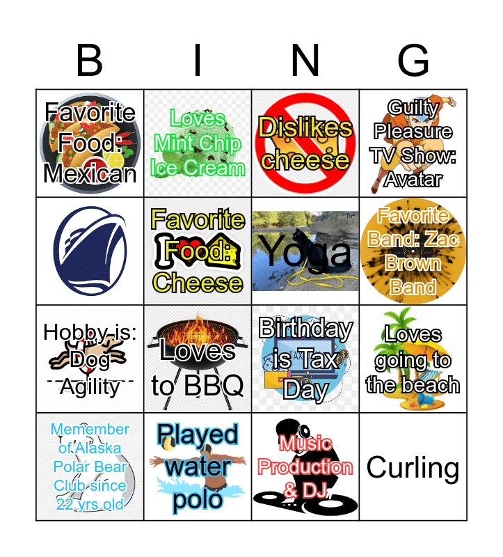 This bingo card has 15 images and 15 words: Played water polo, Loves going to the beach, Dislikes cheese, Favorite Food: Mexican, Hobby is: Dog Agility, Loves Mint Chip Ice Cream, Birthday is Tax Day, Music Production & DJ, Favorite Food: Cheese, Memember of Alaska Polar Bear Club since 22 yrs old, Guilty Pleasure TV Show: Avatar, Loves to BBQ, Favorite Band: Zac Brown Band, Yoga and Curling.