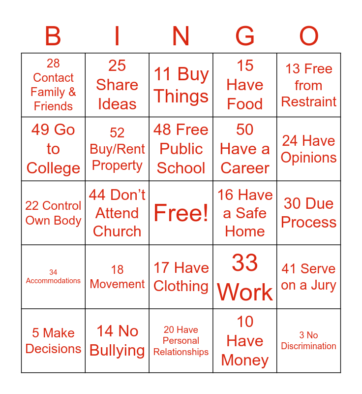 This bingo card has a free space and 44 words: 2 Decision Making, 3 No Discrimination, 4 Choice, 5 Make Decisions, 6 Privacy, 10 Have Money, 11 Buy Things, 12 Free from Harm, 13 Free from Restraint, 14 No Bullying, 15 Have Food, 16 Have a Safe Home, 17 Have Clothing, 18 Movement, 19 Public Transportation, 20 Have Personal Relationships, 21 Family, 22 Control Own Body, 23 Advocate for Yourself, 24 Have Opinions, 25 Share Ideas, 26 Join Clubs, 27 Attend Church, 28 Contact Family & Friends, 29 New Relationships, 30 Due Process, 31 Legal Representation, 32 Miranda Rights, 33 Work, 34 Accommodations, 40 Run for Office, 41 Serve on a Jury, 42 Have Your Own Beliefs, 43 Attend Church, 44 Don’t Attend Church, 45 Access Healthcare, 46 Choose Doctors, 47 Refuse Treatment, 48 Free Public School, 49 Go to College, 50 Have a Career, 51 Sell Things, 52 Buy/Rent Property and 53 Equal Access.