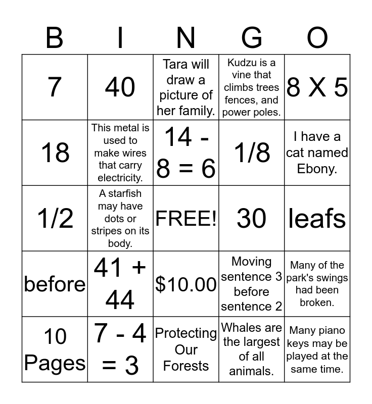 This bingo card has a free space and 24 words: 41 + 44, 7 - 4 = 3, 14 - 8 = 6, 10 Pages, 8 X 5, 7, 18, 40, 30, $10.00, 1/8, 1/2, Moving sentence 3 before sentence 2, Many of the park's swings had been broken., This metal is used to make wires that carry electricity., Whales are the largest of all animals., leafs, Tara will draw a picture of her family., I have a cat named Ebony., A starfish may have dots or stripes on its body., Many piano keys may be played at the same time., before, Kudzu is a vine that climbs trees fences, and power poles. and Protecting Our Forests.
