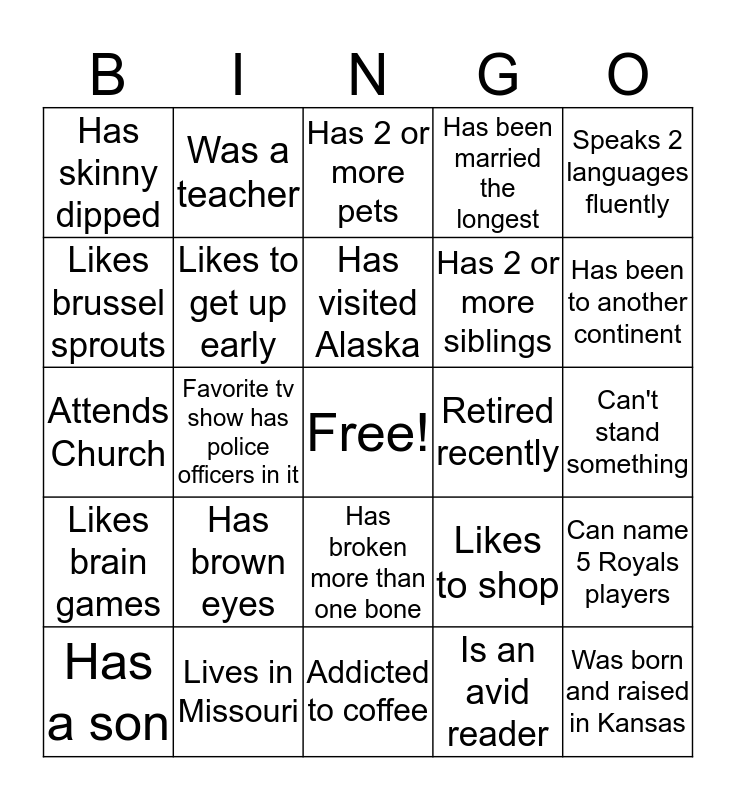 This bingo card has a free space and 24 words: Has brown eyes, Lives in Missouri, Has visited Alaska, Has a son, Speaks 2 languages fluently, Has skinny dipped, Likes brussel sprouts, Was a teacher, Retired recently, Has broken more than one bone, Has 2 or more siblings, Attends Church, Likes to shop, Can name 5 Royals players, Likes to get up early, Is an avid reader, Can't stand something, Has 2 or more pets, Has been to another continent, Favorite tv show has police officers in it, Was born and raised in Kansas, Likes brain games, Has been married the longest and Addicted to coffee.