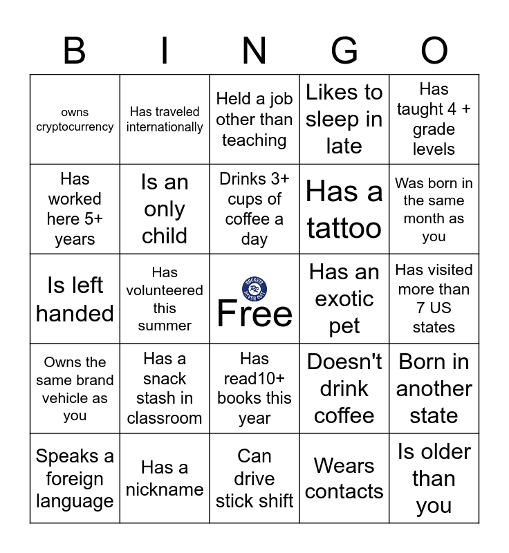 This bingo card has a free space and 24 words: Has a snack stash in classroom, Has a nickname, Drinks 3+ cups of coffee a day, Speaks a foreign language, Has taught 4 + grade levels, owns cryptocurrency, Has worked here 5+ years, Has traveled internationally, Has an exotic pet, Has read10+ books this year, Has a tattoo, Is left handed, Doesn't drink coffee, Born in another state, Is an only child, Wears contacts, Has visited more than 7 US states, Held a job other than teaching, Was born in the same month as you, Has volunteered this summer, Is older than you, Owns the same brand vehicle as you, Likes to sleep in late and Can drive stick shift.