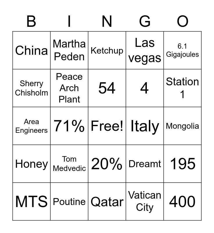 This bingo card has a free space and 64 words: 5, Shelley Kaye, Peter's Drive in, 195, Ikea Catalogue, 17, Martha Peden, Canadian Oil, 54, 23, 20%, Colby Brunner, Mongolia, 6.1 Gigajoules, 2.5, Sherry Chisholm, 71%, China, 240 Million, 4, Tom Medvedic, Honey, Las vegas, Rat, 3, Mary Nolan, Pistachios, Asia, Humming Birds, October 1, Jacqueline C, Coca Cola, Kanata, I am., Station 1, MTS, Apple Sauce, Vatican City, Tongue, Peace Arch Plant, Area Engineers, Italy, Mongolia, Fathead, Brookfield, 400, Poutine, Sudan, Dreamt, Charlie Lake, 12, Ginger Beef, Qatar, Opinions, 13, Geoff Walker, Ketchup, Zambia, Holes, 3500, Brandon Anderson, Ceaser, Sweden and Shrimp Heart.