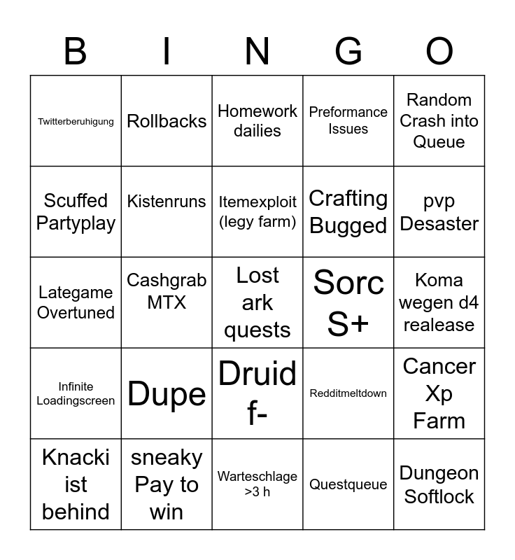 This bingo card has 25 words: Dupe, Warteschlage >3 h, Itemexploit (legy farm), Knacki ist behind, Random Crash into Queue, Twitterberuhigung, Scuffed Partyplay, Rollbacks, Sorc S+, Druid f-, Crafting Bugged, Lategame Overtuned, Redditmeltdown, Cancer Xp Farm, Kistenruns, Dungeon Softlock, Koma wegen d4 realease, Homework dailies, pvp Desaster, Cashgrab MTX, Lost ark quests, sneaky Pay to win, Infinite Loadingscreen, Preformance Issues and Questqueue.
