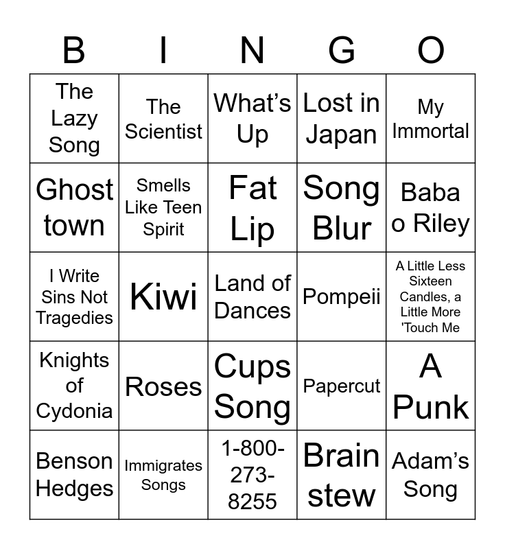This bingo card has 41 words: Free!, I Write Sins Not Tragedies, Bohemian Rhapsody, Smells Like Teen Spirit, Immigrates Songs, Cups Song, Fat Lip, Iris, My Immortal, Knights of Cydonia, Kiwi, Lost in Japan, Land of Dances, A Little Less Sixteen Candles, a Little More 'Touch Me, Pompeii, Roses, The Git Up, The Lazy Song, Tubthumping, What’s Up, A Punk, Adam’s Song, 1-800-273-8255, Song Blur, 7 Rings, Mary’s Song (Oh My My MY), Brain stew, Enter Sandman, Baba o Riley, UGH!, Stolen Dance, The Scientist, Benson Hedges, Cherub Rock, Papercut, Ghost town, Kids, Prayer of the Refugee, Welcome Home, A Praise Chorus and Jumper.