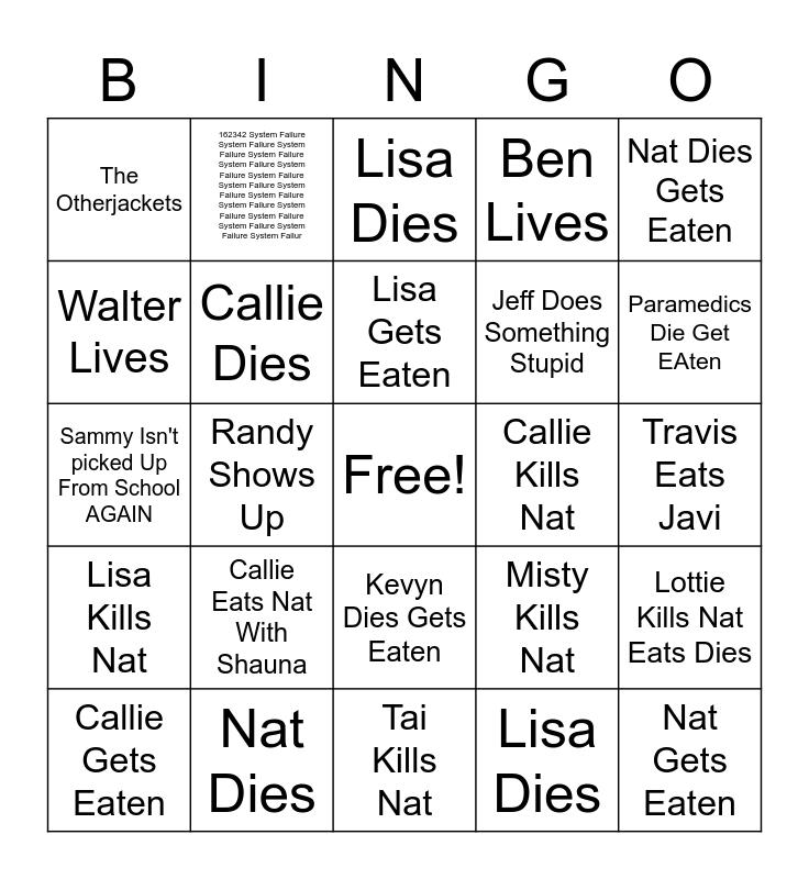 This bingo card has a free space and 34 words: Nat Gets Eaten, Lisa Dies, Lisa Gets Eaten, Snow Shoes Not Used, Lisa Kills Nat, Callie Dies, Nat Dies Gets Eaten, Callie Gets Eaten, 162342 System Failure System Failure System Failure System Failure System Failure System Failure System Failure System Failure System Failure System Failure System Failure System Failure System Failure System Failure System Failure System Failur, Cult Members Die, Lisa Gets Eaten, Lisa Dies, Nat Dies, Nat Gets Eaten, Callie Kills Nat, Paramedics Die Get EAten, Nat Dies, Sammy Isn't picked Up From School AGAIN, Callie Eats Nat With Shauna, Misty Kills Nat, Kevyn Dies Gets Eaten, Krystal Falls off Cliff Second Time, The Otherjackets, Travis Eats Javi, Tai Kills Nat, Nat Gets Eaten, Ben Lives, Tai and Van Kill Nat, Jeff Does Something Stupid, Walter Lives, Simone Gets Eaten, Randy Shows Up, Lottie Kills Nat Eats Dies and Ben Dies.