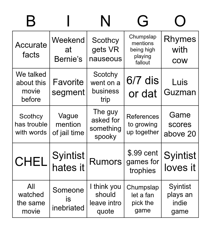 This bingo card has a free space and 24 words: Syintist hates it, Someone is inebriated, Scotchy went on a business trip, All watched the same movie, Rhymes with cow, Accurate facts, We talked about this movie before, Weekend at Bernie’s, References to growing up together, Rumors, 6/7 dis or dat, Scothcy has trouble with words, $.99 cent games for trophies, Syintist loves it, Favorite segment, Chumpslap let a fan pick the game, Game scores above 20, Scothcy gets VR nauseous, Luis Guzman, Vague mention of jail time, Syintist plays an indie game, CHEL, Chumpslap mentions being high playing fallout and I think you should leave intro quote.