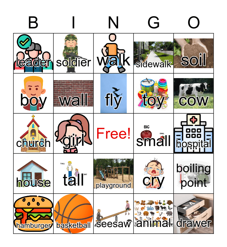 This bingo card has 29 images, a free space and 29 words: hamburger, skirt, girl, thirteen, leader, walk, wall, tall, small, basketball, hospital, drawer, seesaw, animal, cow, mouse, playground, house, soil, church, cry, international, toy, boy, sidewalk, soldier, boiling point, fly and fry chicken.