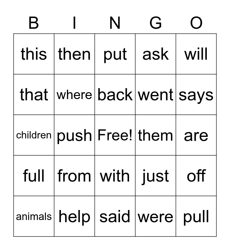 This bingo card has a free space and 24 words: from, help, back, animals, will, this, that, then, them, with, went, children, just, off, where, were, are, put, says, push, pull, full, ask and said.