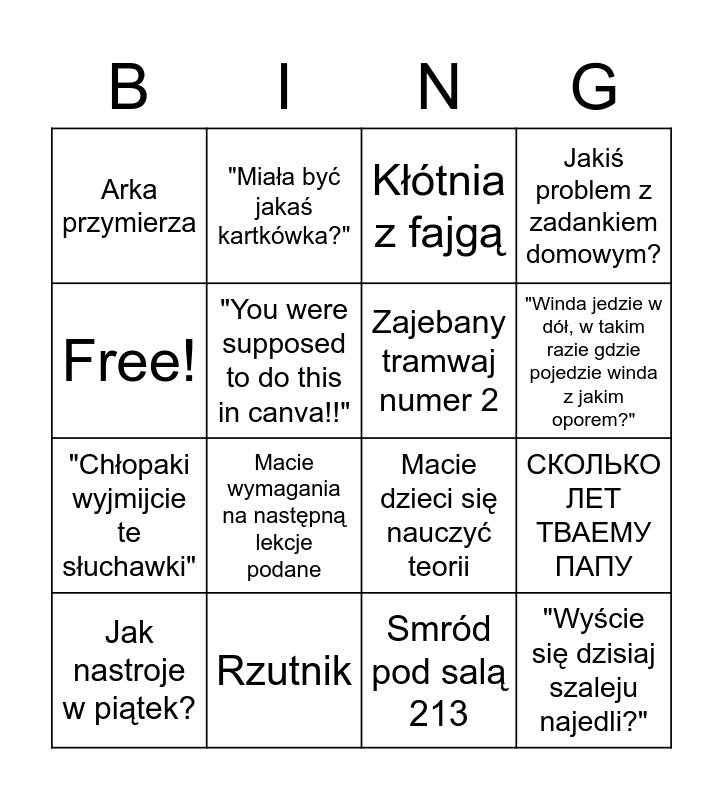 This bingo card has 16 words: Rzutnik, СКОЛЬКО ЛЕТ ТВАЕМУ ПАПУ, Kłótnia z fajgą, Arka przymierza, "Chłopaki wyjmijcie te słuchawki", "Miała być jakaś kartkówka?", Macie dzieci się nauczyć teorii, Smród pod salą 213, Free!, "You were supposed to do this in canva!!", Jak nastroje w piątek?, Jakiś problem z zadankiem domowym?, Macie wymagania na następną lekcje podane, "Winda jedzie w dół, w takim razie gdzie pojedzie winda z jakim oporem?", Zajebany tramwaj numer 2 and "Wyście się dzisiaj szaleju najedli?".