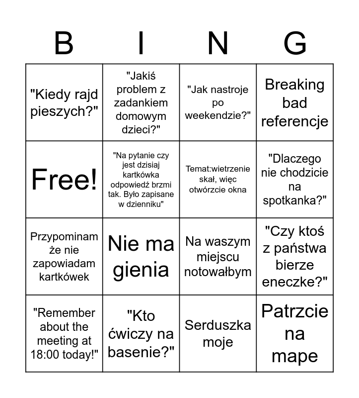 This bingo card has 16 words: "Kto ćwiczy na basenie?", "Czy ktoś z państwa bierze eneczke?", "Jak nastroje po weekendzie?", "Kiedy rajd pieszych?", Przypominam że nie zapowiadam kartkówek, "Jakiś problem z zadankiem domowym dzieci?", Na waszym miejscu notowałbym, Serduszka moje, Free!, "Na pytanie czy jest dzisiaj kartkówka odpowiedź brzmi tak. Było zapisane w dzienniku", "Remember about the meeting at 18:00 today!", Breaking bad referencje, Nie ma gienia, "Dlaczego nie chodzicie na spotkanka?", Temat:wietrzenie skał, więc otwórzcie okna and Patrzcie na mape.