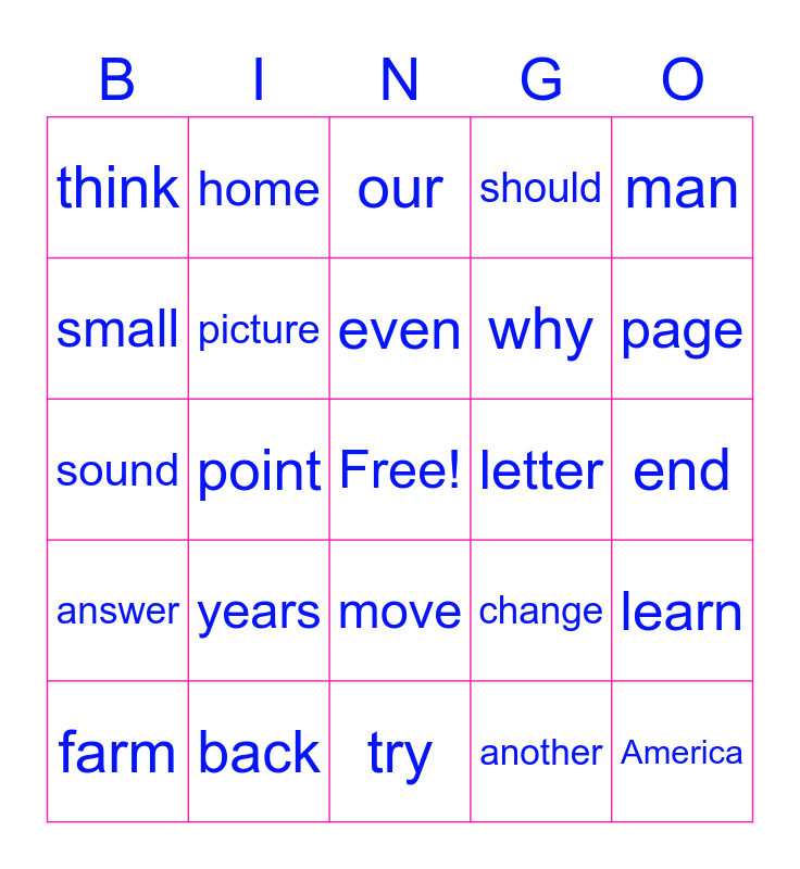 This bingo card has a free space and 24 words: years, back, even, farm, man, think, small, home, letter, move, why, sound, change, learn, picture, another, end, our, page, point, America, answer, should and try.