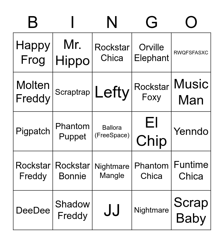 This bingo card has a free space and 24 words: Rockstar Bonnie, Shadow Freddy, Lefty, DeeDee, RWQFSFASXC, Happy Frog, Molten Freddy, Mr. Hippo, El Chip, Nightmare Mangle, Rockstar Foxy, Pigpatch, Phantom Chica, Funtime Chica, Scraptrap, Nightmare, Yenndo, Rockstar Chica, Music Man, Phantom Puppet, Scrap Baby, Rockstar Freddy, Orville Elephant and JJ.