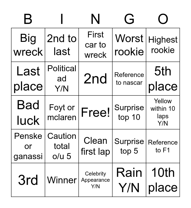 This bingo card has a free space and 24 words: Caution total o/u 5, Winner, 2nd, 3rd, Highest rookie, Big wreck, Last place, 2nd to last, Surprise top 10, Clean first lap, Reference to nascar, Bad luck, Surprise top 5, Reference to F1, Political ad Y/N, Rain Y/N, Yellow within 10 laps Y/N, First car to wreck, 5th place, Foyt or mclaren, 10th place, Penske or ganassi, Worst rookie and Celebrity Appearance Y/N.