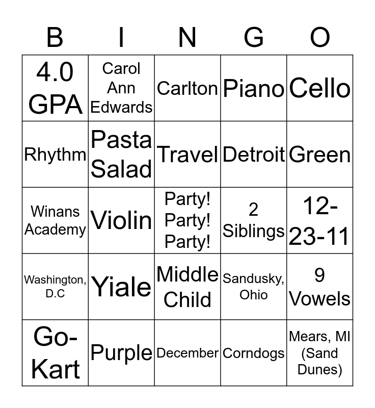 This bingo card has a free space and 24 words: Yiale, Purple, Travel, Go-Kart, Cello, 4.0 GPA, Rhythm, Carol Ann Edwards, 2 Siblings, Middle Child, Detroit, Winans Academy, Sandusky, Ohio, 9 Vowels, Pasta Salad, Corndogs, 12-23-11, Carlton, Green, Violin, Mears, MI (Sand Dunes), Washington, D.C, Piano and December.