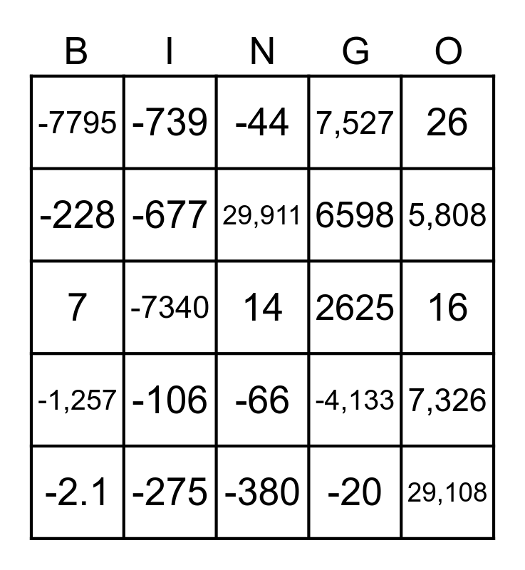 This bingo card has a free space and 29 words: -2.1, A, -7340, 4186, -7795, -44, -677, -106, 2625, -275, 16, 29,108, -380, -20, 5,808, 160, -66, -1,257, 26, 7, -4,133, 7,737, 6598, -228, 7,527, -739, 7,326, 29,911 and 81.