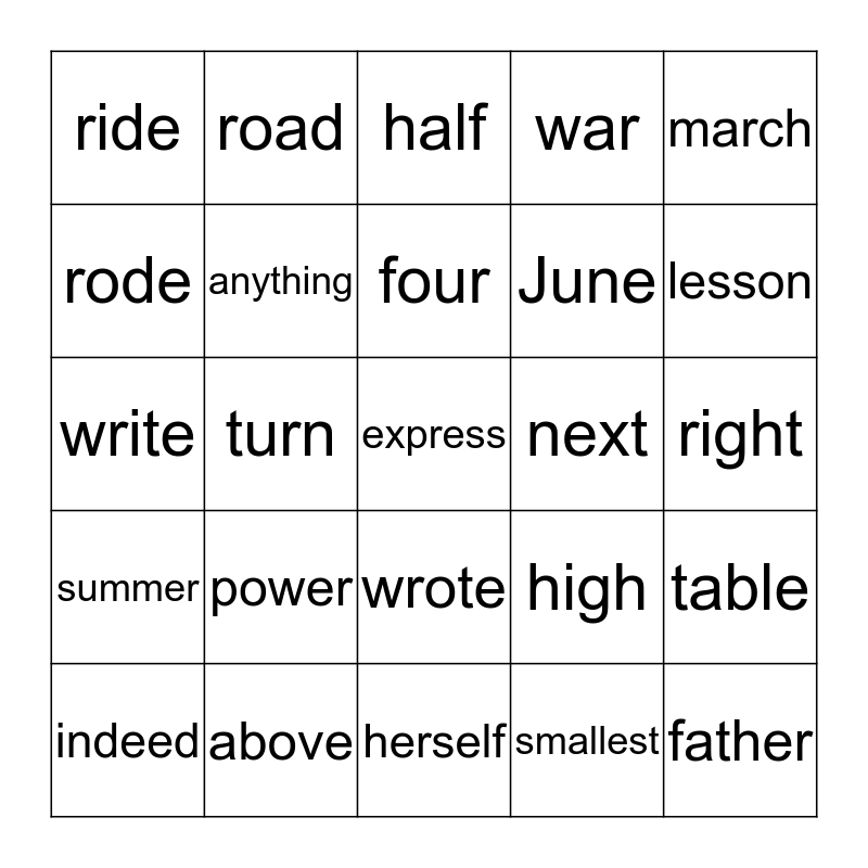 This bingo card has 25 words: power, herself, four, indeed, march, ride, rode, road, next, wrote, June, write, high, table, anything, father, right, half, lesson, turn, express, above, summer, war and smallest.
