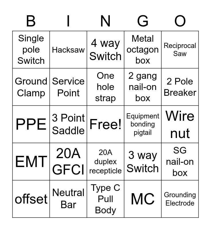 This bingo card has a free space and 24 words: 20A GFCI, Neutral Bar, One hole strap, offset, Reciprocal Saw, Single pole Switch, Ground Clamp, Hacksaw, Equipment bonding pigtail, 20A duplex recepticle, 2 gang nail-on box, PPE, 3 way Switch, SG nail-on box, Service Point, MC, Wire nut, 4 way Switch, 2 Pole Breaker, 3 Point Saddle, Grounding Electrode, EMT, Metal octagon box and Type C Pull Body.