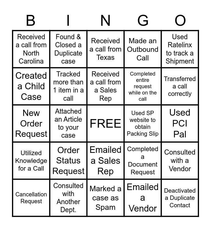 This bingo card has a free space and 24 words: Order Status Request, Consulted with Another Dept., Received a call from a Sales Rep, Cancellation Request, Used Ratelinx to track a Shipment, Received a call from North Carolina, Created a Child Case, Found & Closed a Duplicate case, Used SP website to obtain Packing Slip, Emailed a Sales Rep, Completed entire request while on the call, New Order Request, Completed a Document Request, Consulted with a Vendor, Tracked more than 1 item in a call, Emailed a Vendor, Used PCI Pal, Received a call from Texas, Transferred a call correctly, Attached an Article to your case, Deactivated a Duplicate Contact, Utilized Knowledge for a Call, Made an Outbound Call and Marked a case as Spam.