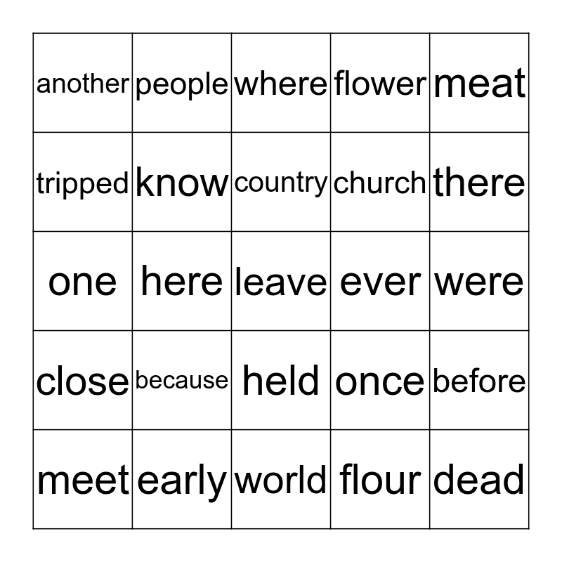 This bingo card has 25 words: because, world, country, meet, meat, another, tripped, people, ever, held, church, one, once, before, know, dead, were, where, there, here, leave, early, close, flower and flour.
