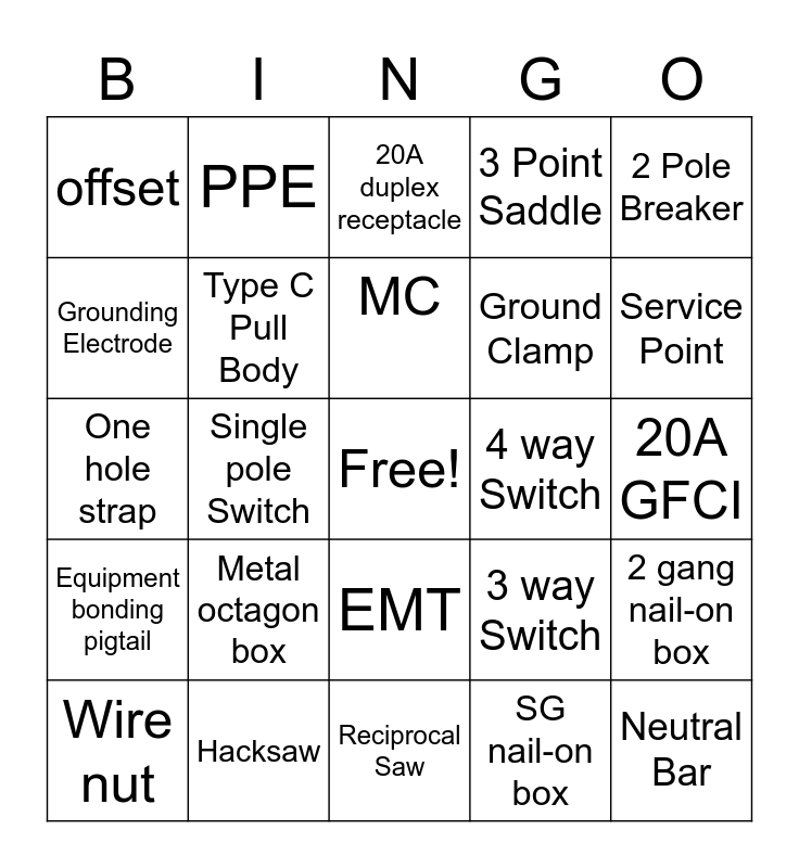This bingo card has a free space and 24 words: Metal octagon box, Hacksaw, MC, Wire nut, 2 Pole Breaker, offset, Grounding Electrode, PPE, 4 way Switch, EMT, Ground Clamp, One hole strap, 3 way Switch, 2 gang nail-on box, Type C Pull Body, SG nail-on box, 20A GFCI, 20A duplex receptacle, Service Point, Single pole Switch, Neutral Bar, Equipment bonding pigtail, 3 Point Saddle and Reciprocal Saw.