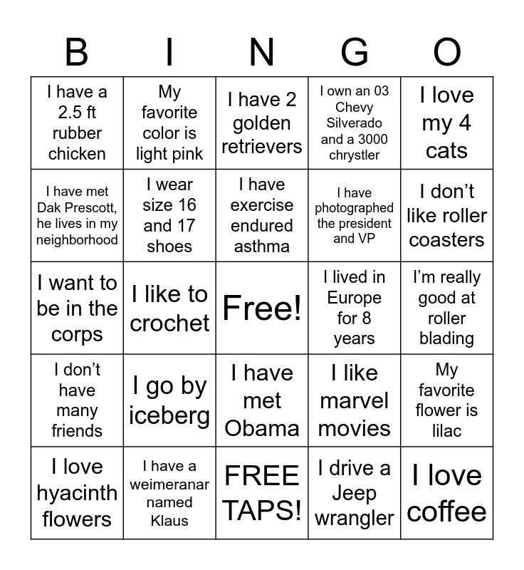 This bingo card has a free space and 24 words: I go by iceberg, I have a weimeranar named Klaus, I have exercise endured asthma, I love hyacinth flowers, I love my 4 cats, I have a 2.5 ft rubber chicken, I have met Dak Prescott, he lives in my neighborhood, My favorite color is light pink, I lived in Europe for 8 years, I have met Obama, I have photographed the president and VP, I want to be in the corps, I like marvel movies, My favorite flower is lilac, I wear size 16 and 17 shoes, I drive a Jeep wrangler, I’m really good at roller blading, I have 2 golden retrievers, I don’t like roller coasters, I like to crochet, I love coffee, I don’t have many friends, I own an 03 Chevy Silverado and a 3000 chrystler and FREE TAPS!.