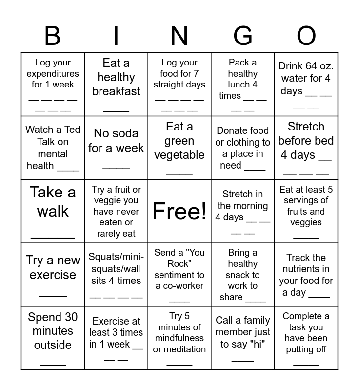 This bingo card has a free space and 34 words: Turn off the TV and read ____, Call a family member just to say "hi" ____, Smile at someone ____, Eliminate food with added sugars for a day ____, Try a new exercise ____, No soda for a week ____, Drink 64 oz. water for 4 days __ __ __ __, Spend 30 minutes outside ____, Eat a healthy breakfast ____, Have a vegetarian day ____, Eat a green vegetable ____, Log your food for 7 straight days __ __ __ __ __ __ __, Try a new healthy recipe ____, Share a healthy recipe ____, Stretch in the morning 4 days __ __ __ __, Stretch before bed 4 days __ __ __ __, Exercise at least 3 times in 1 week __ __ __, Take a walk _____, Squats/mini-squats/wall sits 4 times __ __ __ __, Bring a healthy snack to work to share ____, Send a "You Rock" sentiment to a co-worker ____, Choose a weekend and only spend money on what's necessary ____, Log your expenditures for 1 week __ __ __ __ __ __ __, Eat at least 5 servings of fruits and veggies _____, Try 5 minutes of mindfulness or meditation _____, Complete a task you have been putting off _____, Pack a healthy lunch 4 times __ __ __ __, Perform a random act of kindness ____, Donate food or clothing to a place in need ____, Watch a Ted Talk on mental health ____, Write down 3 things you are grateful for ____, Try a fruit or veggie you have never eaten or rarely eat, Track the nutrients in your food for a day ____ and Find a cooking buddy to make and eat a meal with ____.