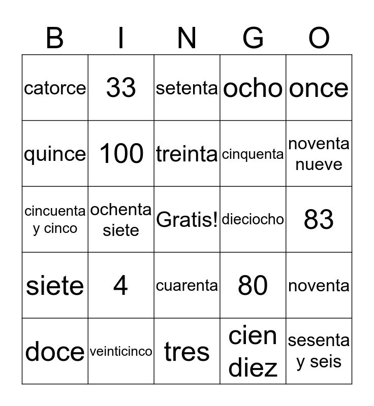 This bingo card has a free space and 24 words: 4, veinticinco, treinta, doce, once, catorce, quince, 33, dieciocho, cuarenta, cinquenta, cincuenta y cinco, 80, noventa, 100, cien diez, 83, setenta, noventa nueve, ochenta siete, sesenta y seis, siete, ocho and tres.